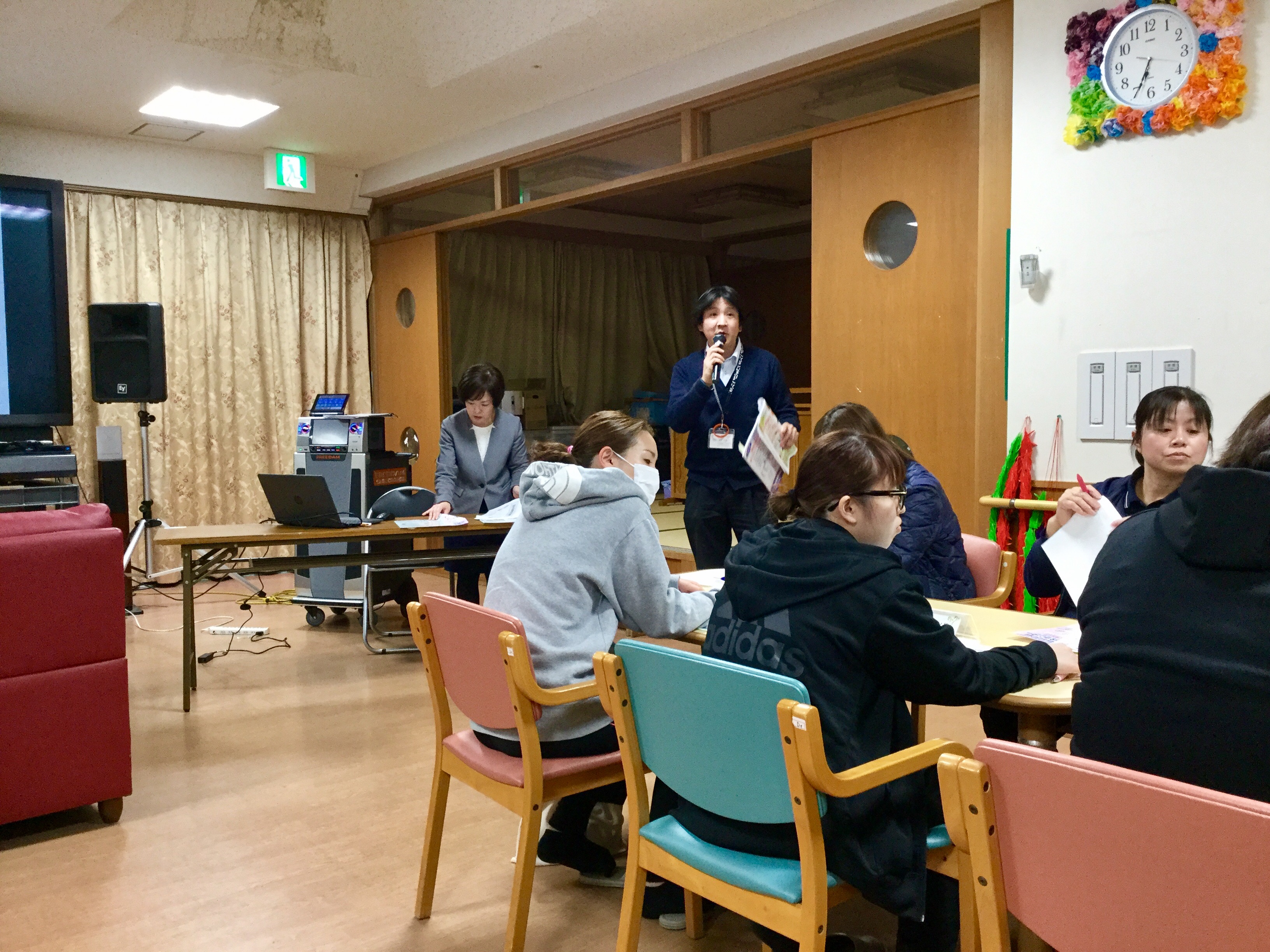 会場のデイルームに、仕事を終わられたスタッフの皆さんが40名ほど集まられ、研修会がスタートしました! (熊本菊寿会様では、毎月定期的にテーマを決められスタッフ向けの研修会を開催されているそうです)