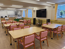 全36室の部屋は、全て異なる壁紙で部屋を選ぶ楽しさがありWi-Fiも利用できるなど快適性を追求。全館バリアフリーで車いすでも生活でき、共用の浴室には座位がとれる方を対象とした特殊浴槽もあります。コミュニティルームには大画面のテレビやオーディオも完備され、食事や余暇を楽しめます。食事は委託業者との自由契約で、栄養のバランスを考えた食事が食べられます。