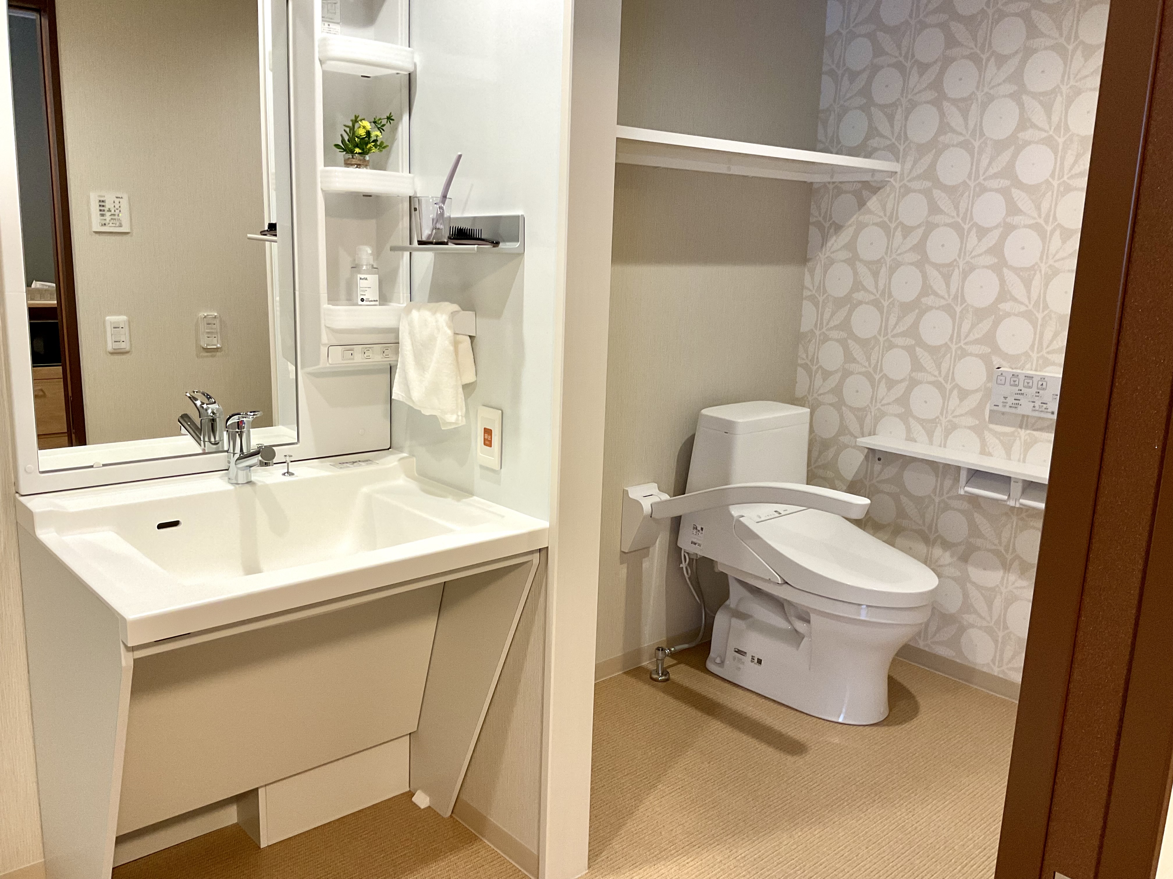 居室の洗面台とトイレです。車椅子でも入れるスペースがとってあります✨