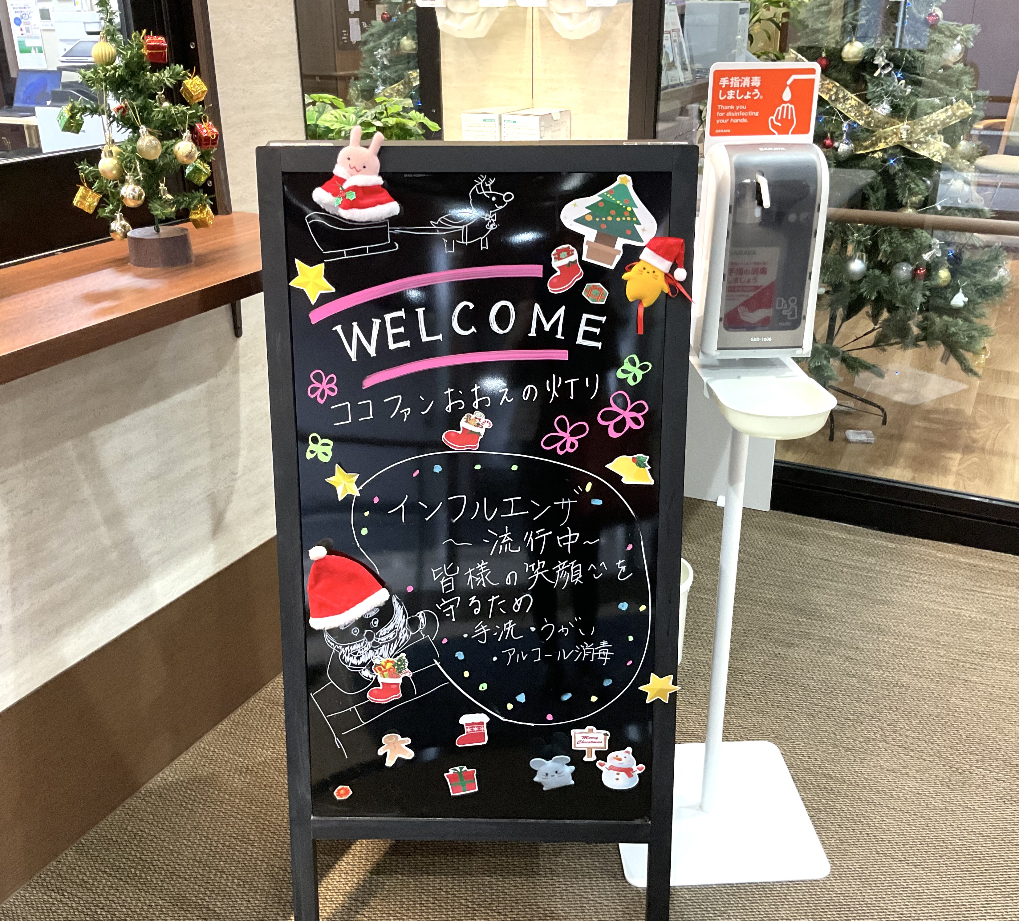 さて、先日熊本市中央区大江に9月にオープンしたサービス付き高齢者向け住宅『ココファンおおえの灯り』にお邪魔させていただきました!玄関には可愛らしいウェルカムボードがあり、クリスマスツリーが飾られていました✨
